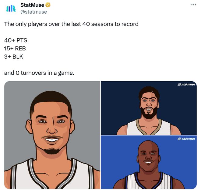其次文班成为近40年,第三位单场交出至少40分15篮板3盖帽,同时0失误的球员,前两人是浓眉哥与奥尼尔。