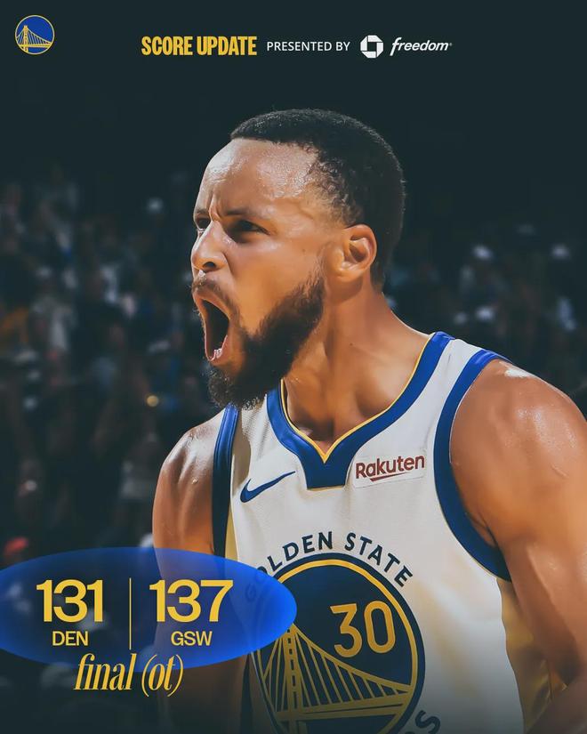 北京时间10月24日,NBA常规赛,勇士历经加时137-131击败掘金。库里投篮25中14,三分12中6,罚球8中8,狂砍42分6板7助3断1帽,正负值+15全场最高!第四节和加时赛,库里一共轰下22分。第四节最后30秒,戈登和库里神仙打架。
